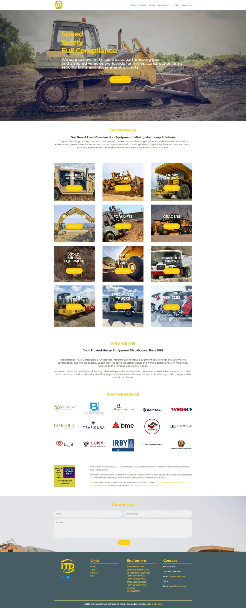 International Truck Distributors have been in the business since 1991. Their products include new and used heavy equipment, trucks, excavators, armored vehicles, and mining equipment. Their clients are AngloGold Ashanti, Trafigura, and Sumitomo, among others. Their operations are spread across South Africa, Australia, Nigeria, the Democratic Republic of Congo, Angola, Mozambique, and other countries.